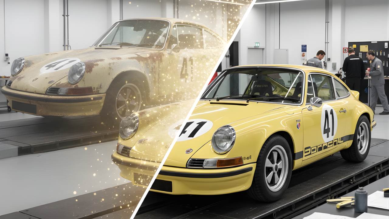 Alt Text: A split-screen showing a rusty vintage Porsche being restored to a clean yellow finish with racing number 41.